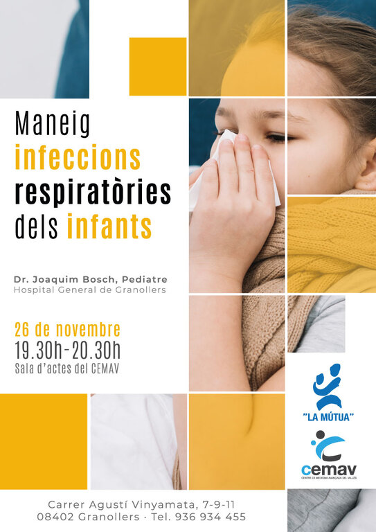 El dimarts 26 de novembre de 19.30 a 20.30h tindrà lloc la conferència sobre el maneig de les infeccions respiratòries dels infants de la mà del pediatre Dr. Joaquim Bosch.