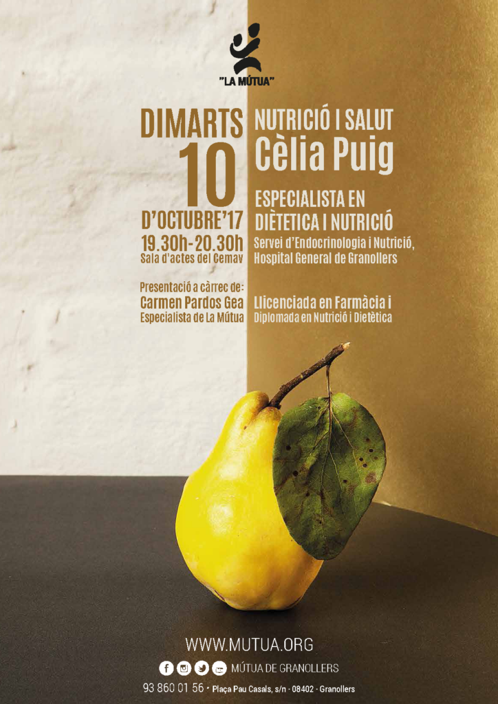 Cèlia Puig, col·laboradora en el servei d’endocrinologia i nutrició a l’Hospital General de Granollers, és una reconeguda professional en l’àmbit de la nutrició i la dietètica. Ella ens parlarà de totes les qüestions que més interessen a les persones que tenen cura de la seva alimentació i porten una dieta sana i equilibrada. La presentació de la xerrada serà a càrrec de Carmen Pardos Gea, especialista de La Mútua, llicenciada en farmàcia i diplomada en Dietètica i Nutrició.